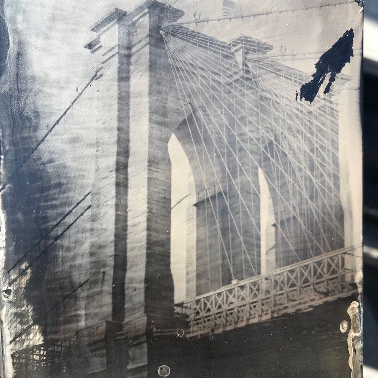 The Brooklyn Bridge was still where I had seen it last, and as always proved a very willing subject. I shot two plates, one at four seconds, and the other at two, then decided that three looked to be the best exposure time. I shot half a dozen plates, managed to scratch one as I was pulling it out of the fixer, up till then it looked to be a fine tintype.
