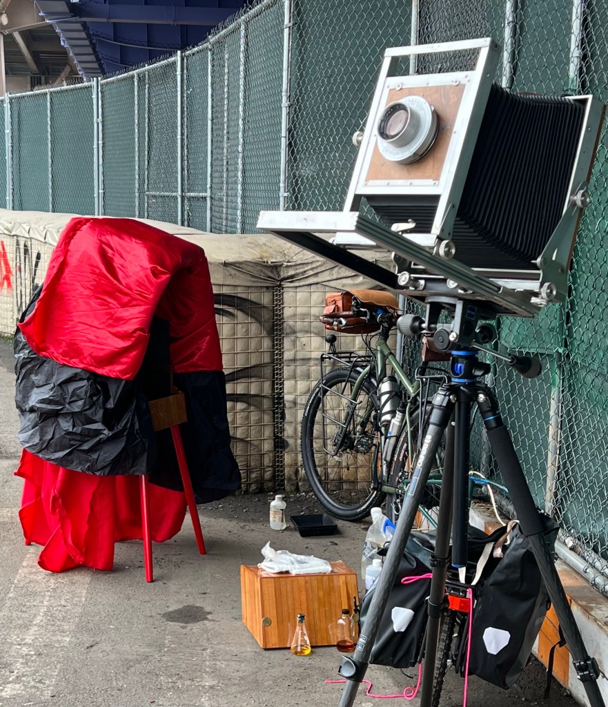 Most of the gear survived the trip, though I did manage to spill some silver nitrate. Can afford to do that. Stuff is not cheap. The camera set up, and a plate poured. A little overcast, but still plenty of UV light available. Aperture set to f16, plate loaded into holder, and first tintype exposed.