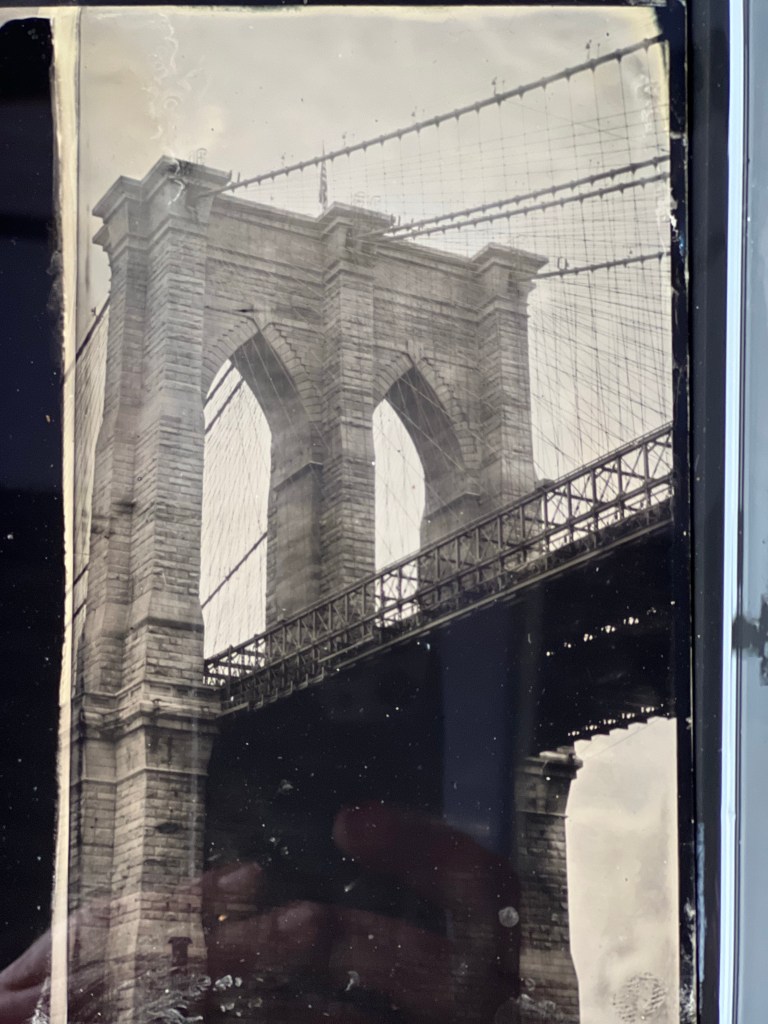 At long last I have done a test ride with my portable dark box. The ride it self was short, just down the street to my favorite spot with a view of the Brooklyn Bridge. Always a willing subject.
