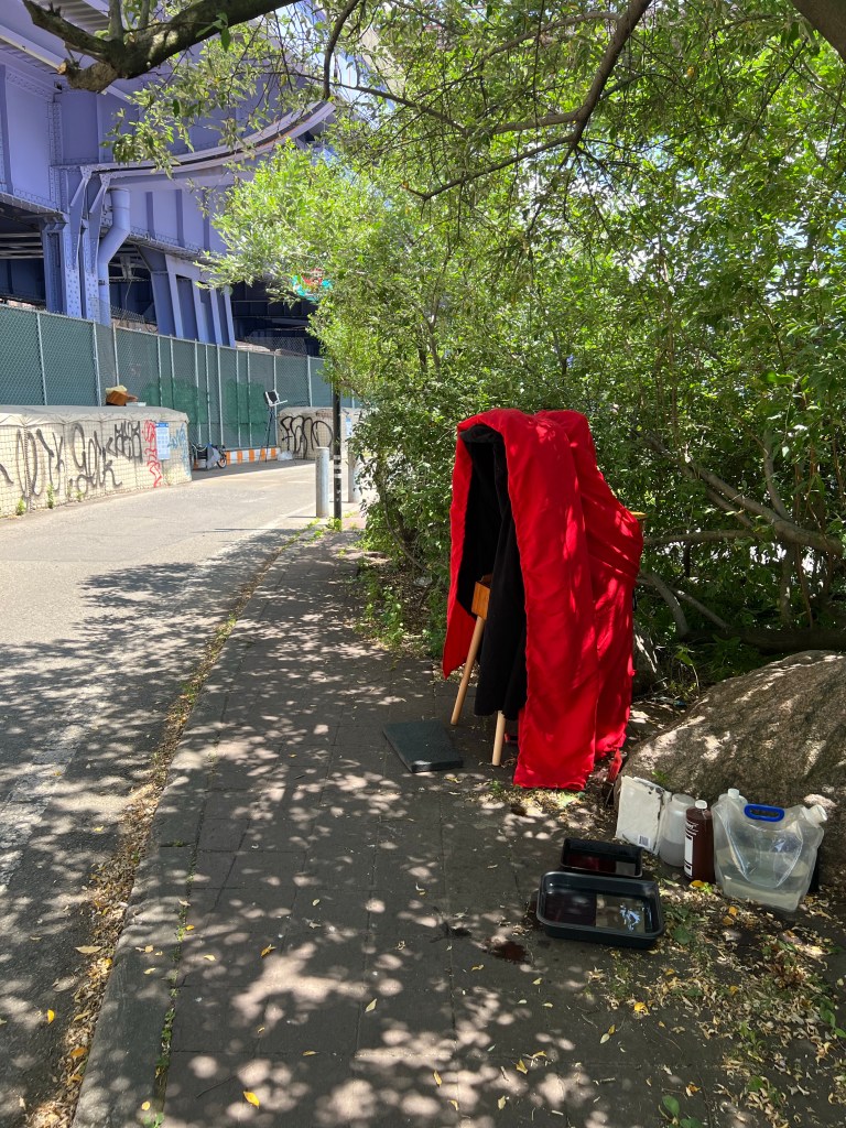 Another beautiful day for wet plate work. Sunny, but not crazy hot. New batch of silver nitrate mixed up the other day, and “excited “ . This just means that a glass plate was coated with colloidian, and placed in the silver bath, but rather than pulling it out after four minutes, as one would normally do, it is allowed to remain overnight.