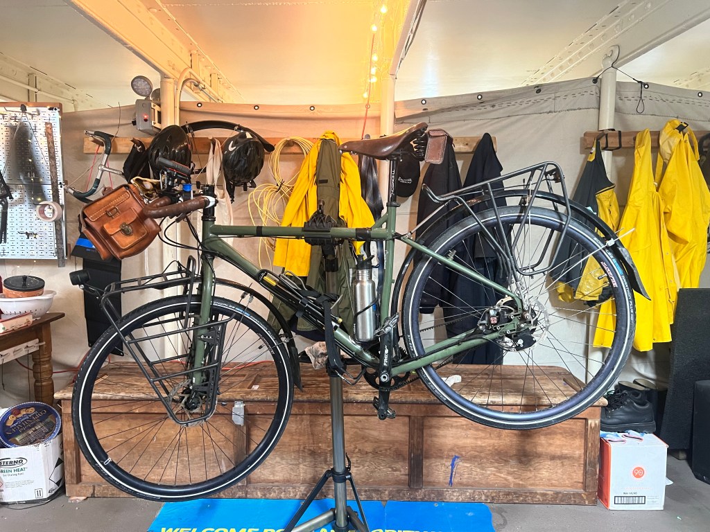 The bicycle is running well. Put “Sweetpea” up in the stand last week to switch to touring tires. All the difference in the world.